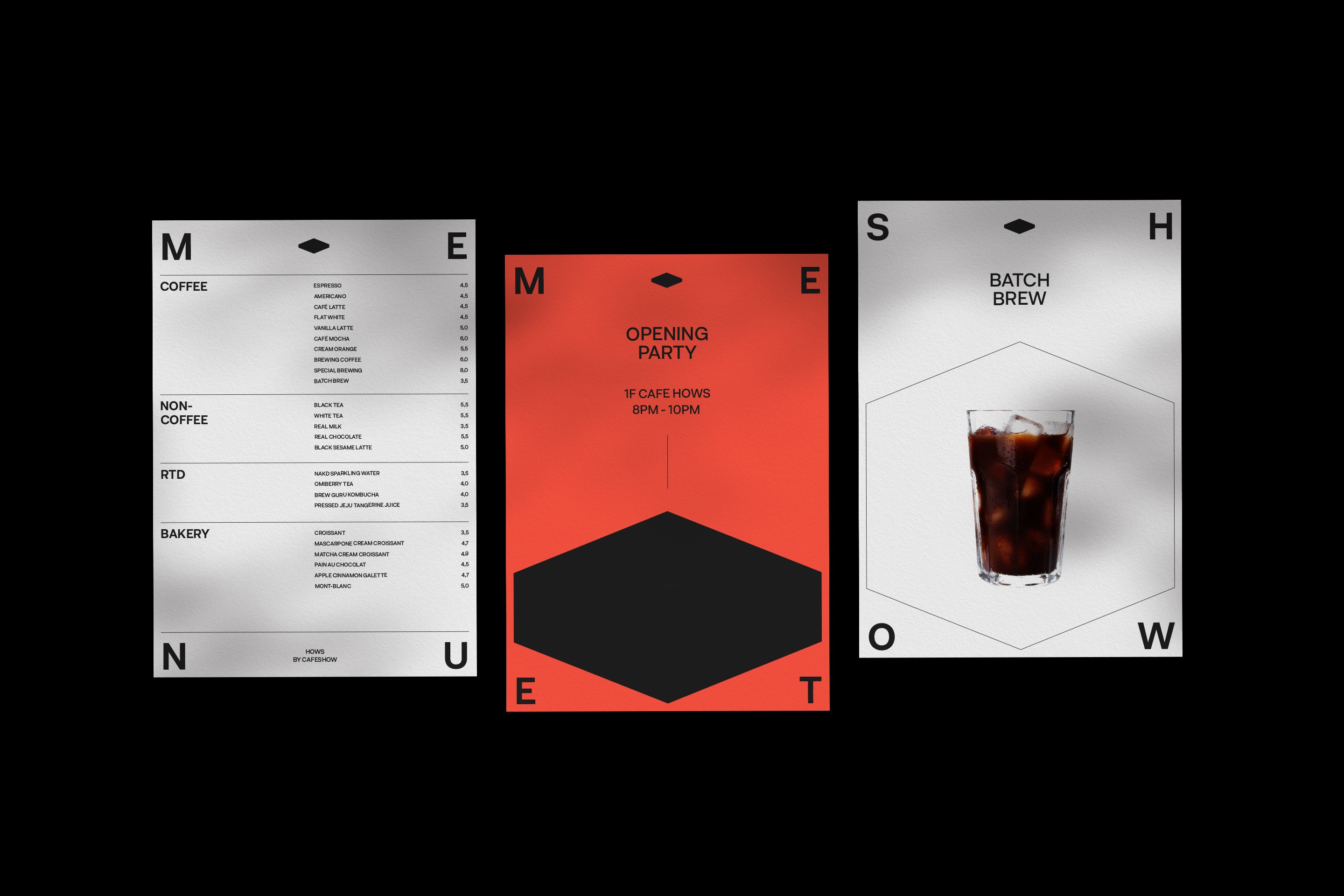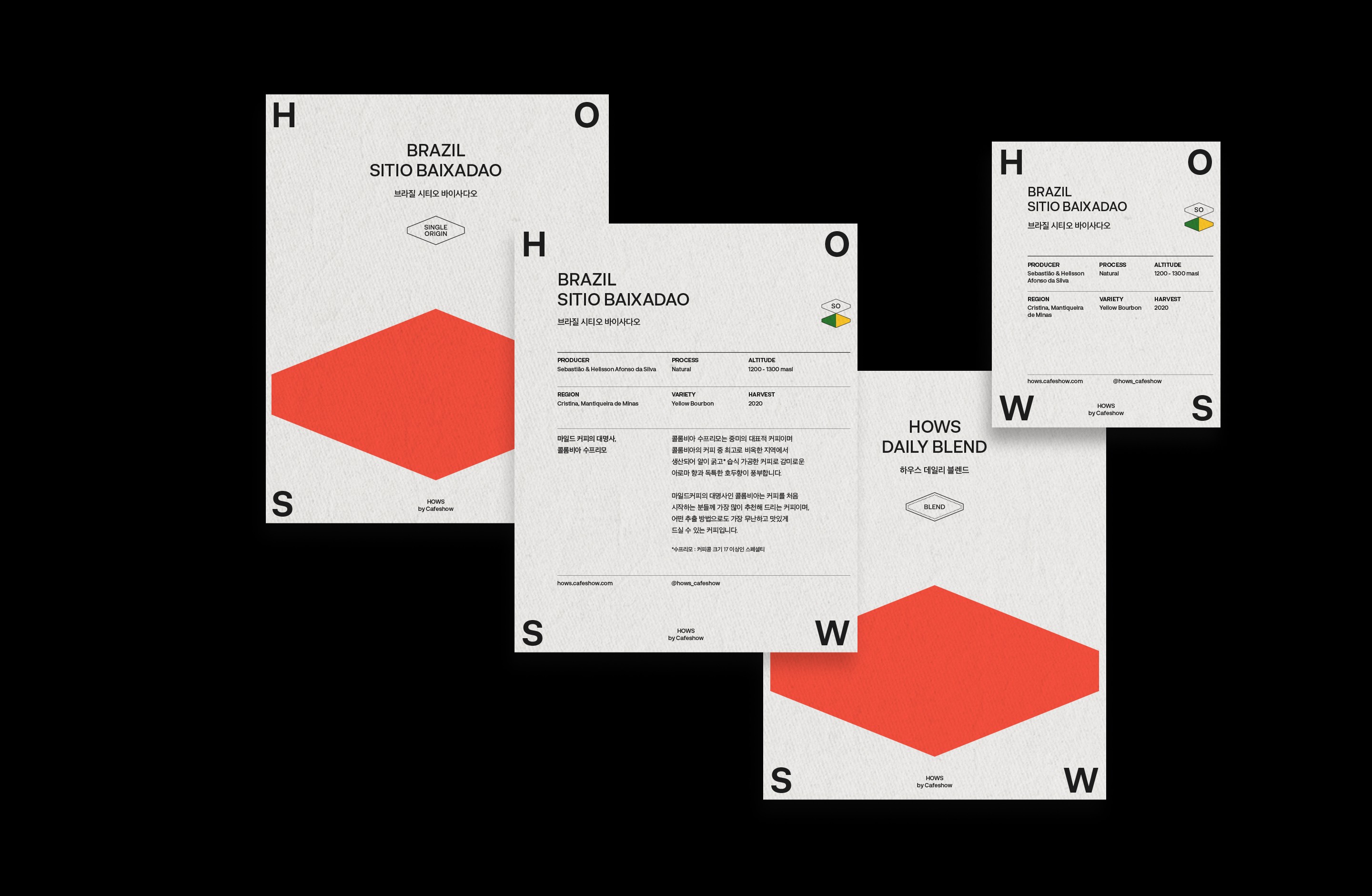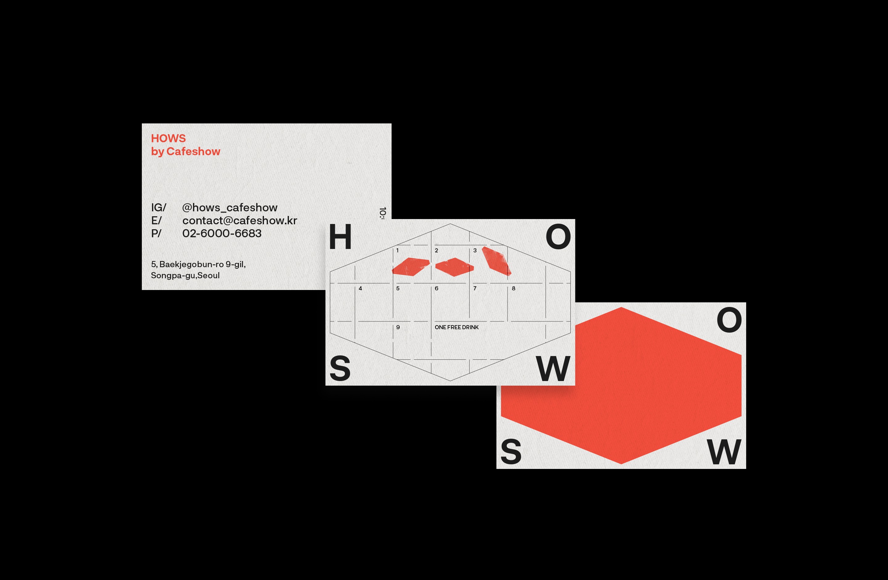 HOWS by Cafeshow는 커피에 일가견이 있는 사람들과 브랜드들이 모이는 곳으로, 도심 속 문화와 디자인이 가진 소통의 힘을 전하고자 하는 Cafeshow의 기업 비전으로 오픈한 복합 커피 문화 공간입니다. 건물의 역할과 목적을 특정하고 싶지 않다는 Cafeshow의 니즈에 따라 전반적으로 공간 자체에 초점을 맞춘 브랜드 디자인을 진행했습니다.
